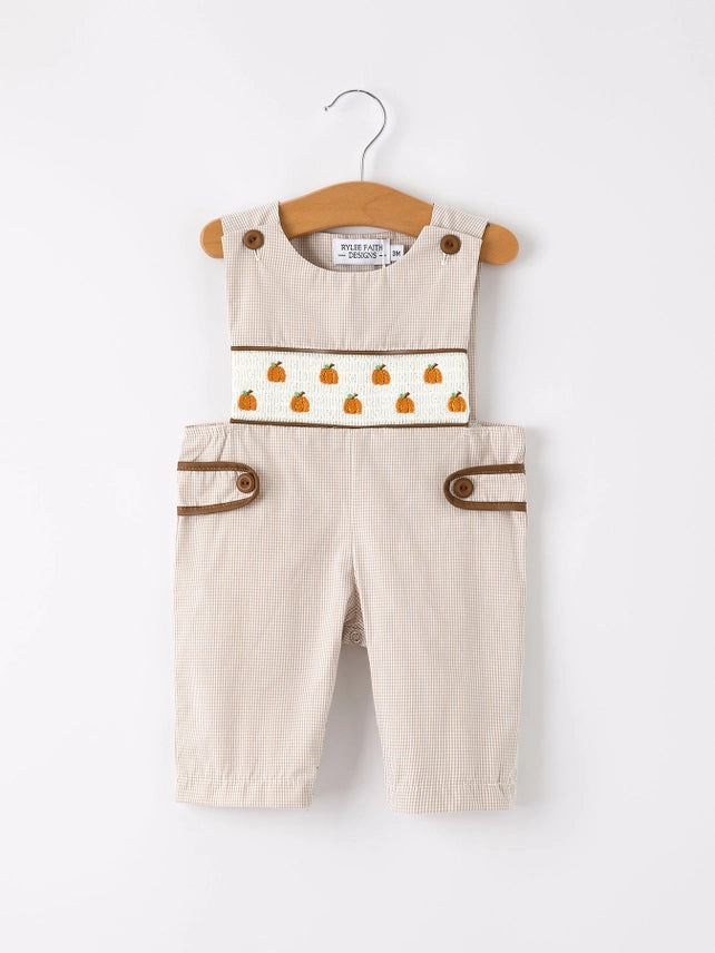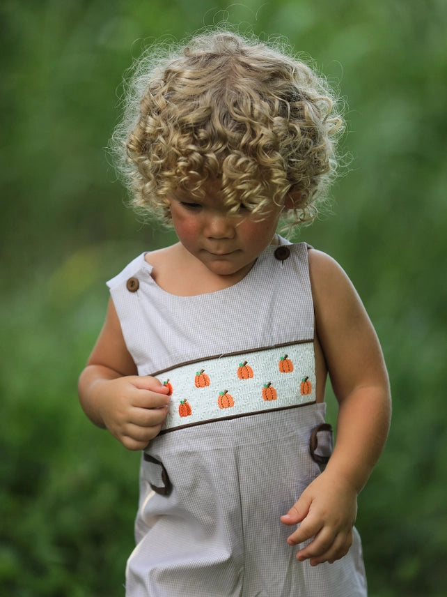 This adorable Pumpkin Longall from boutique brand Rylee Faith Designs is made from 100% soft cotton, perfect for keeping your little one comfy all day. Featuring a charming pumpkin embroidery and a tan and white check pattern, it’s great worn alone or layered with a long sleeve shirt for those cooler evenings. A playful and cozy addition to your child’s wardrobe!